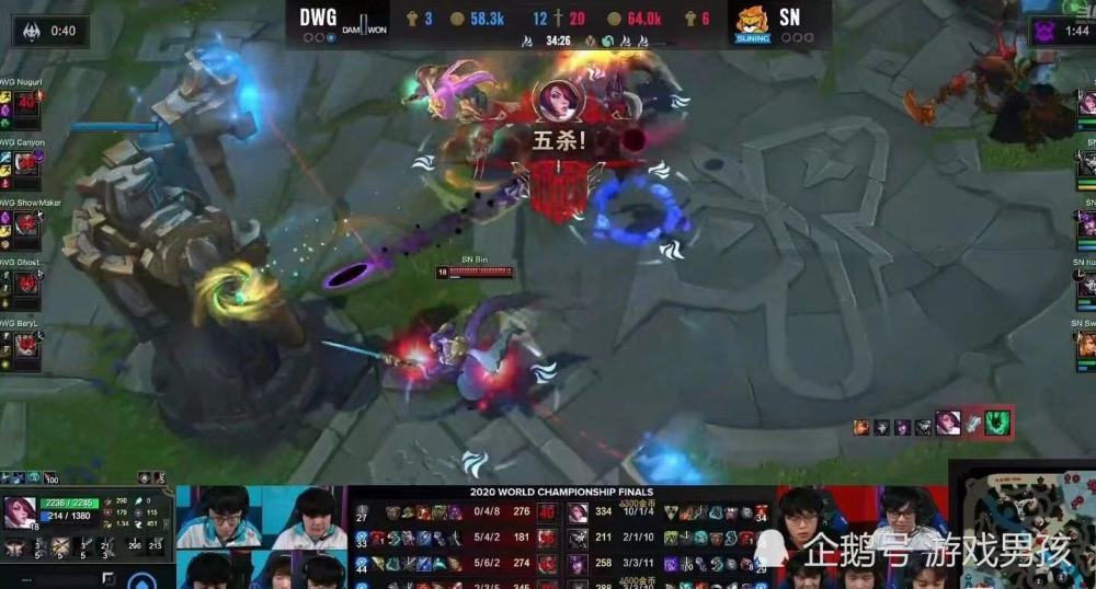 在SN与G2的加赛中,G2将比赛拖入大后期,G2阵容明显后期更加强力,几乎G2就要拿下SN,以小组第一出线,但是在G2打完小龙撤退时,阿Bin的船长绕后,先是大招减速G2众人,压迫双C走位,接着一个二连桶,将Caps和阿P炸成残血,闪现AQ干净利落拿下G2双C人头。