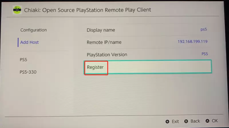 在点到Add Host,输入一个名字、PS4/5的IP地址、PS的版本,再点击register,会提示输入8位pin