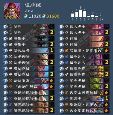 来自营地用户dreru投稿的一套埋牌贼,他用这套牌以64%的胜率打上了传说。尽管携带了任务,但是这套卡组中任务仅仅是用来触发奋进的探险者、资深探险者和天空上将库拉格的。这套卡组中主要有两种制胜手段,一种方法是用资深探险者、资深探险者给的幸运币、暗影步和“赤烟”腾武打combo来单回合打出多张手牌造大范或者刷任务达人创造出前期对手无法处理的场面取胜,另一种方法是奖券老板+偷渡者/大女皇夏柯扎拉在后期一回合铺场压倒对手。这套卡组相比于目前环境中盗贼主流的连击贼而言有更强的造范/刷任务达人能力,面对前期缺乏单解的卡组往往能抢下节奏获得胜利。这套卡组面对进化萨和防战是劣势对局,但是打其他职业大部分都是小优对局,面对术士和德鲁伊则是大优。总的来说这套卡组在使用过程中操作感强,推荐给喜欢玩组合技卡组的玩家使用。