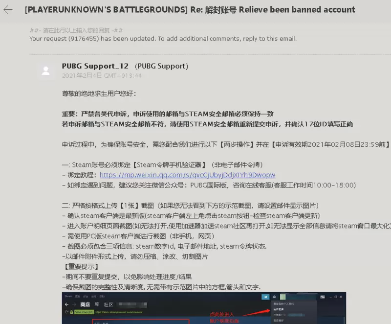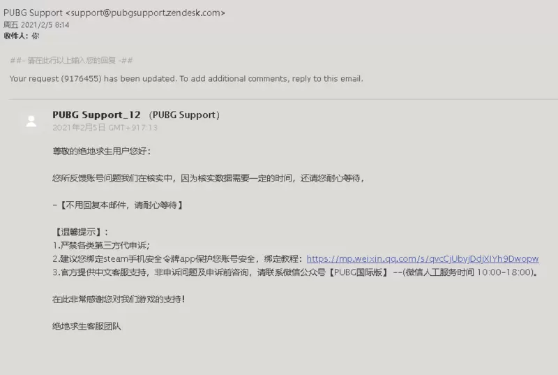 提交后会收到绝地求生官方客服的邮件,按照要求上传绑定手机令牌后的截图