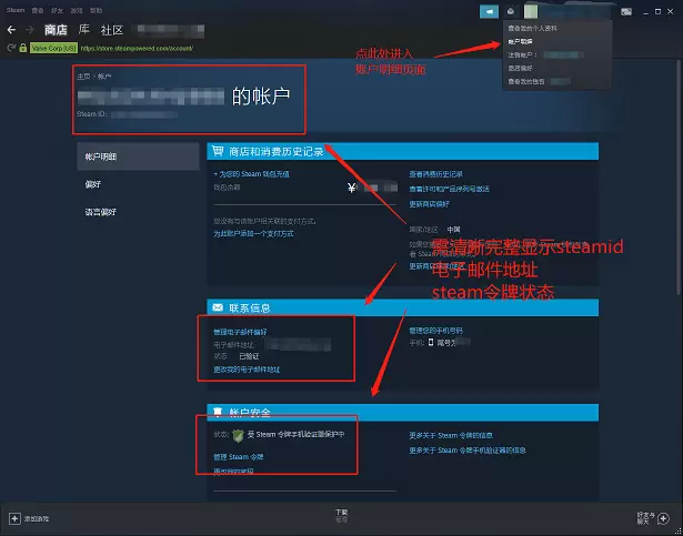 4.STEAM 17位ID可以在Steam客户端右上角“账户明细”找到