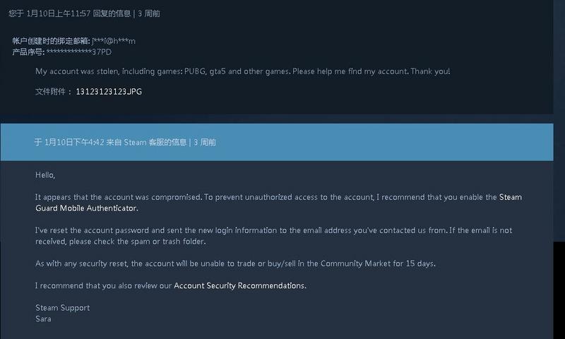 附件需要上传截图:1、Steam客服回复的邮件 2、帐号IP登录地点记录。