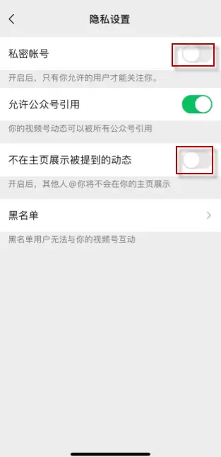 6、进入【隐私设置】页面后,把【私密账号】按钮关闭,同时开启【不在主页展示被提到的动态】选项即可。