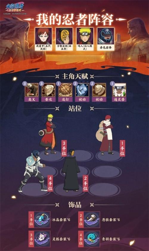 Tips:该阵容需要把我爱罗【五代风影】最后一个放入阵容,在小队忍者均为满血状态下,土主的普攻会为最后一个放入小队的忍者提供护盾,并且该阵容所携带的饰品仅供参考,可根据自身的实际情况以及理解进行调整。