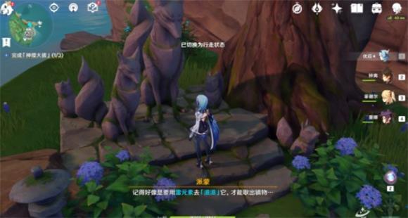 1、首先玩家需要来到图中的位置捡神瞳,随后使用留念镜照小狐狸雕像。