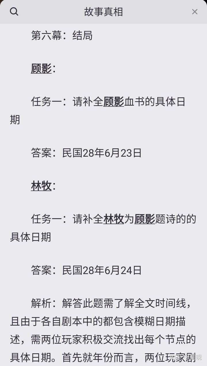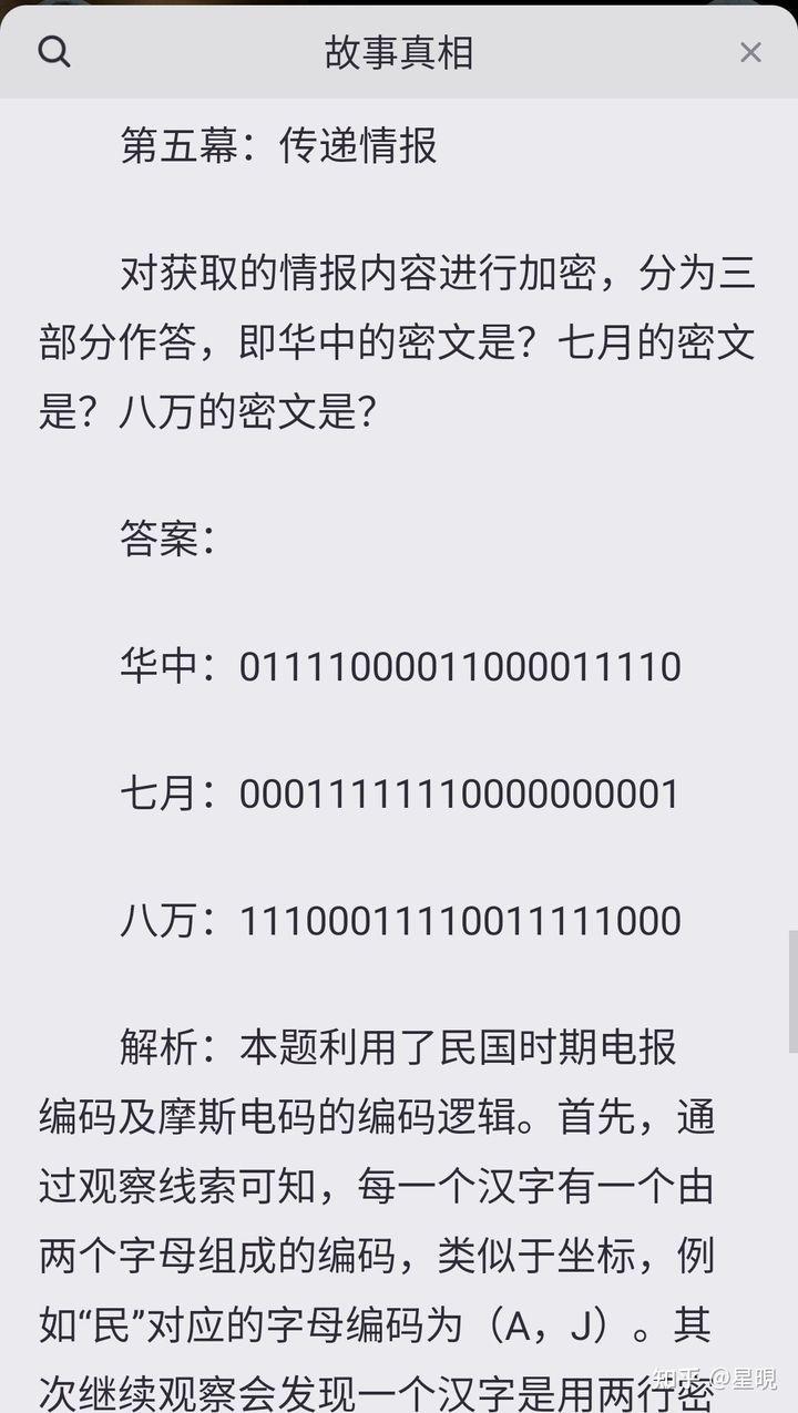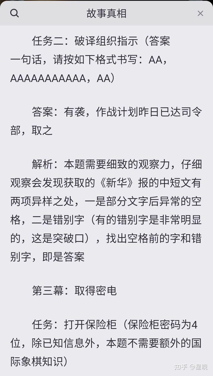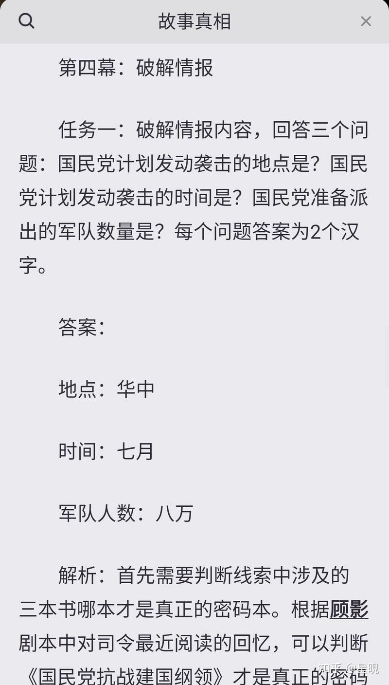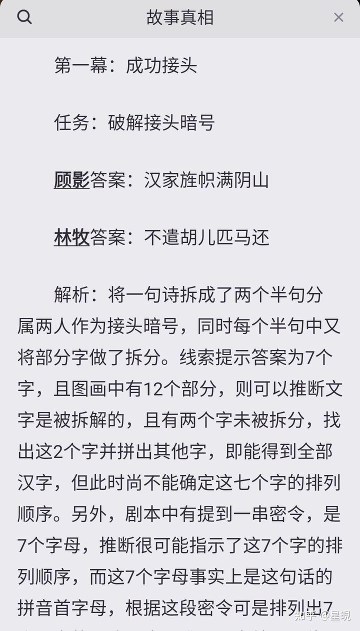 解析:将一句诗拆成了两个半句分 属两人作为接头暗号,同时每个半句中又 将部分字做了拆分。线索提示答案为7个 字,且图画中有12个部分,则可以推断文 字是被拆解的,且有两个字未被拆分,找 出这2个字并拼出其他字,即能得到全部 汉字,但此时尚不能确定这七个字的排列 顺序。另外,剧本中有提到一串密令,是 7个字母,推断很可能指示了这7个字的排 列顺序,而这7个字母事实上是这句话的 拼音首字母,根据这段密令可是排列出7 个汉字的正确顺序,唯一一点就是两位玩 家剧本中的密令都有一个字母是重复的, 没关系,到这一步之后最多尝试两次就会 得到正确答案。