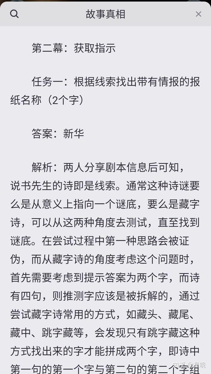解析:两人分享剧本信息后可知, 说书先生的诗即是线索。通常这种诗谜要 么是从意义上指向一个谜底,要么是藏字 诗,可以从这两种角度去测试,直至找到 谜底。在尝试过程中第一种思路会被证 伪,而从藏字诗的角度考虑这个问题时, 首先需要考虑到提示答案为两个字,而诗 有四句,则推测字应该是被拆解的,通过 尝试藏字诗常用的方式,如藏头、藏尾、 藏中、跳字藏等,会发现只有跳字藏这种 方式找出来的字才能拼成两个字,即诗中 第一句的第一个字与第二句的第二个字组 成"新”字,第三句的第三个字和第四局的