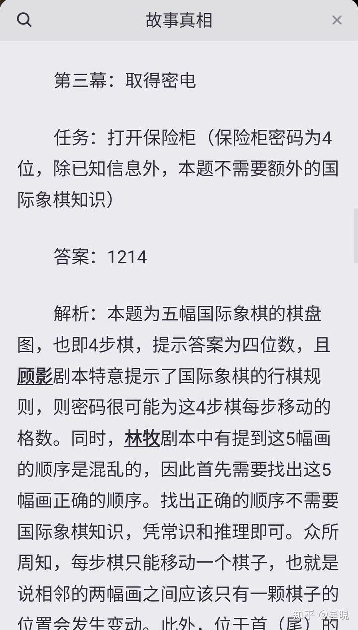 解析:本题为五幅国际象棋的棋盘 图,也即4步棋,提示答案为四位数,且 顾影剧本特意提示了国际象棋的行棋规 则,则密码很可能为这4步棋每步移动的 格数。同时,林牧剧本中有提到这5幅画 的顺序是混乱的,因此首先需要找出这5 幅画正确的顺序。找出正确的顺序不需要际象棋知识,凭常识和推理即可。众所 周知,每步棋只能移动一个棋子,也就是 说相邻的两幅画之间应该只有一颗棋子的 位置会发生变动。此外,位于首(尾)的 画只有一幅画与之相比移动了一颗棋子, 显示这个颗棋行棋之后(前)的样子,而 位于中间的画则会有两幅与之相比移动了 一个棋子,分别代表这步棋的上一步的样 子和这步棋行棋之后的样子。由于没有信 息可以帮助区分首尾的画究竟哪一幅为 首,哪一幅为尾,根据上面提到的两个逻 辑,会得到两个顺序相反的序列,但没关 系,先依据顾影剧本中给出的国际象棋的 行棋规则,数出每步棋移动了几格,得到 两组答案,用这两组答案去分别尝试即 可。