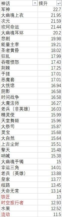 dnf神话装备排名图。这张图片回应了神话装备属性到底提升多少的问题。除去三个cd套,平均值为16.83%。然而提升最高的神话有22.7%,最低的水果也只有12.52%,差距还是很大的。同时,也从数据上显示了“总的来说,强的套装神话一般提升大,弱的套装一般提升小”的预想。