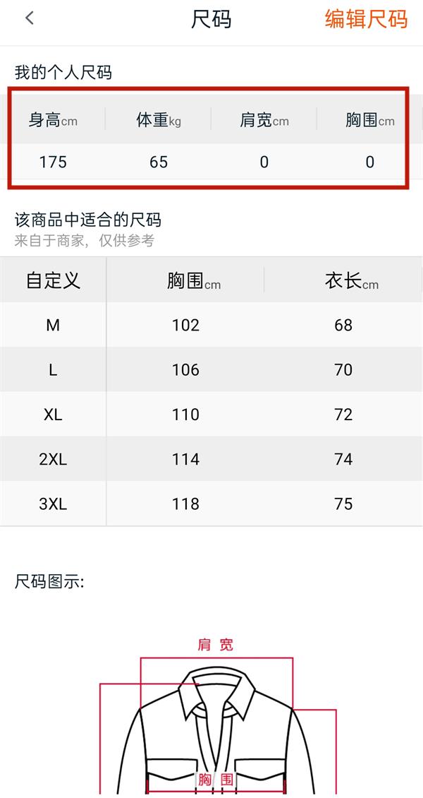 2、点击查看尺码后,即可查看到个人设置的尺码信息。