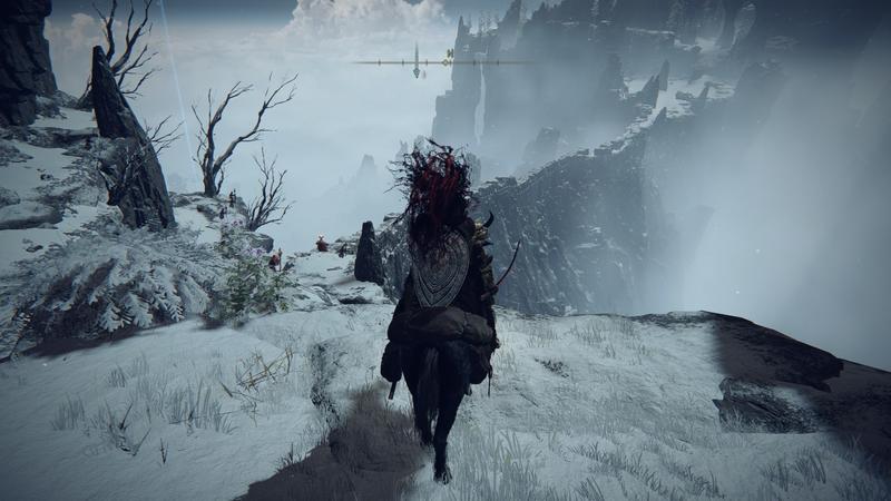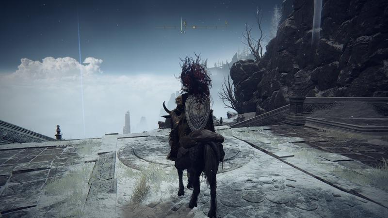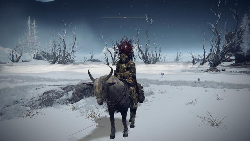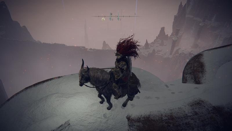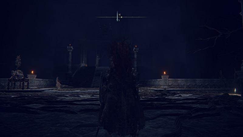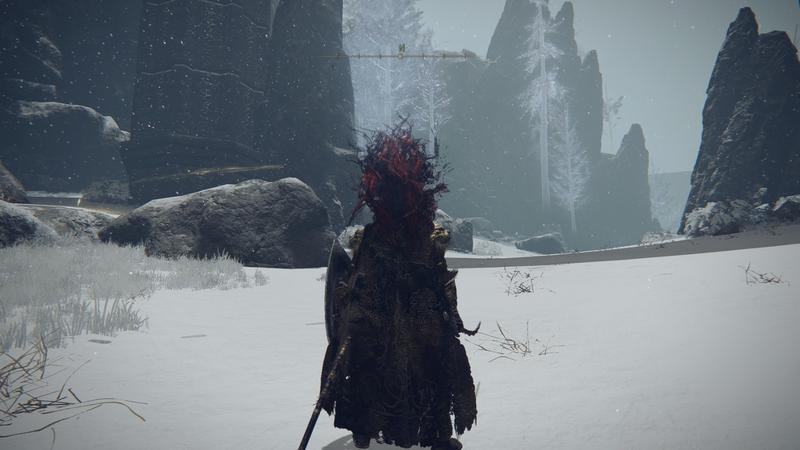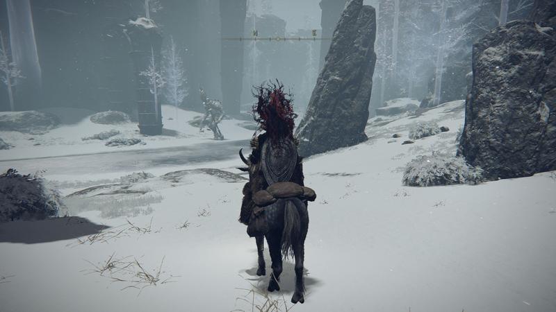 这里需要注意,你走到大概如上图所示这个位置就会强制下马,之后再往前走走,就能碰到目标:血指:老翁(入侵者),他拿的就是尸山血海,出血伤害,伤害相当高。打败他就能拿到尸山血海了,还有一副老翁的面具。