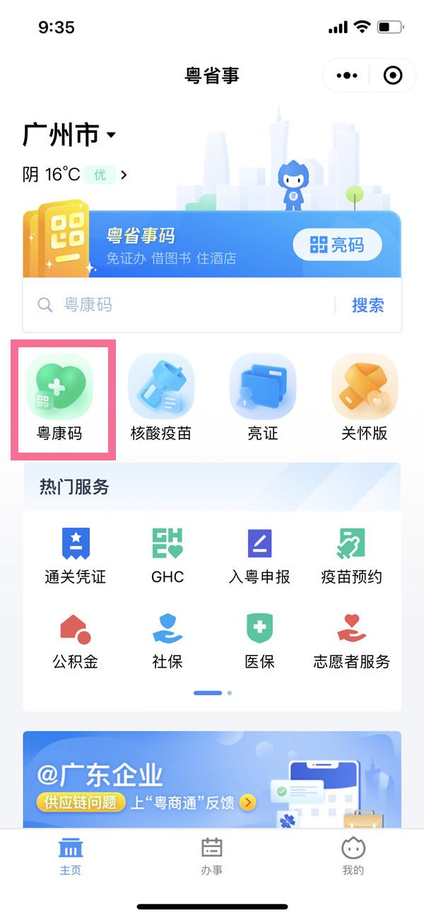 1、打开粤省事小程序,点击【粤康码】。