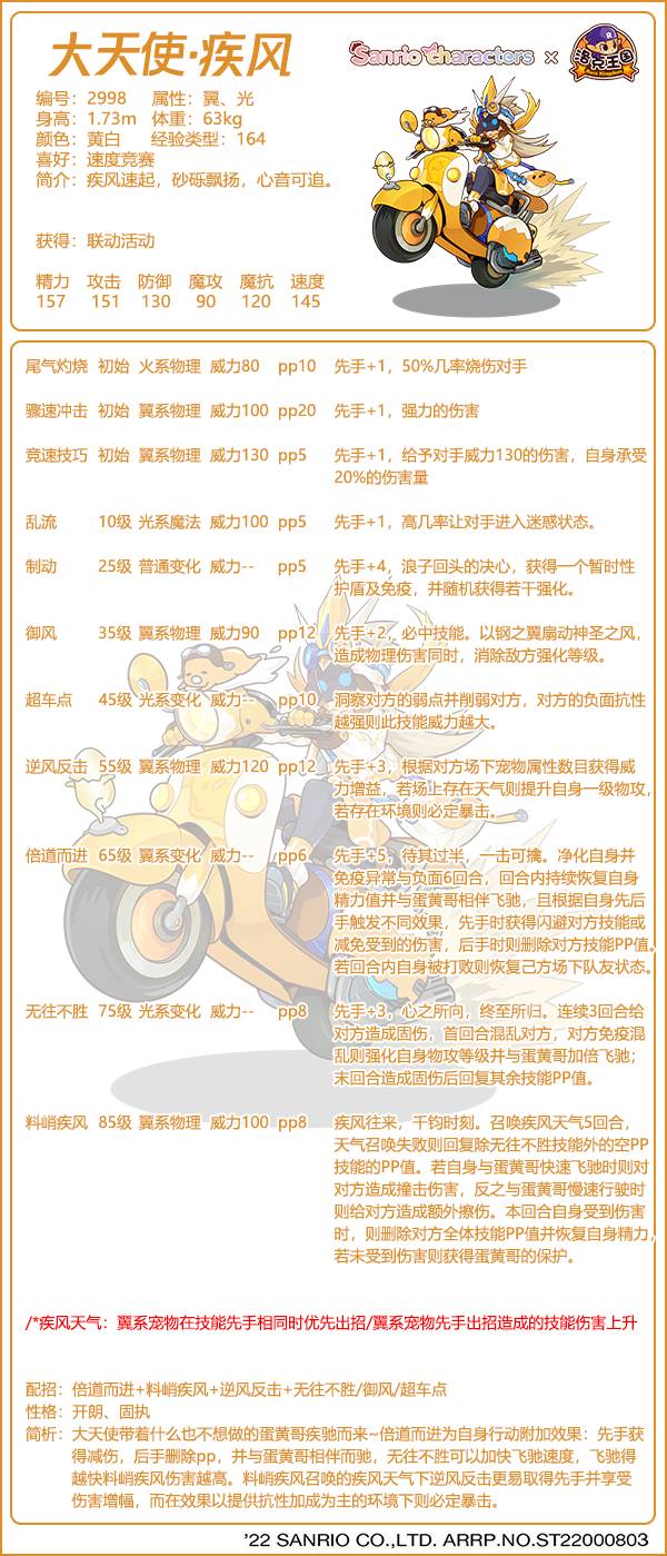 大天使带着什么也不想做的蛋橙哥疾驰而来~倍道而进为自身行动附加效果先手获取减伤,后手删除pp,并与蛋橙哥相伴而驰,无往不胜可以加快飞驰速度,飞驰得越快料峭疾风伤害越高。料峭疾风召唤的疾风天气下逆风反击更易取得先手并享受伤害增幅,而在效果以提供抗性加变为主的环境下则必定暴击。