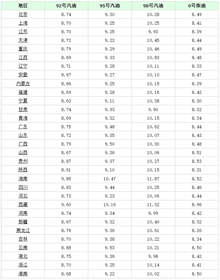 4月6日全国各省市汽油价格表: