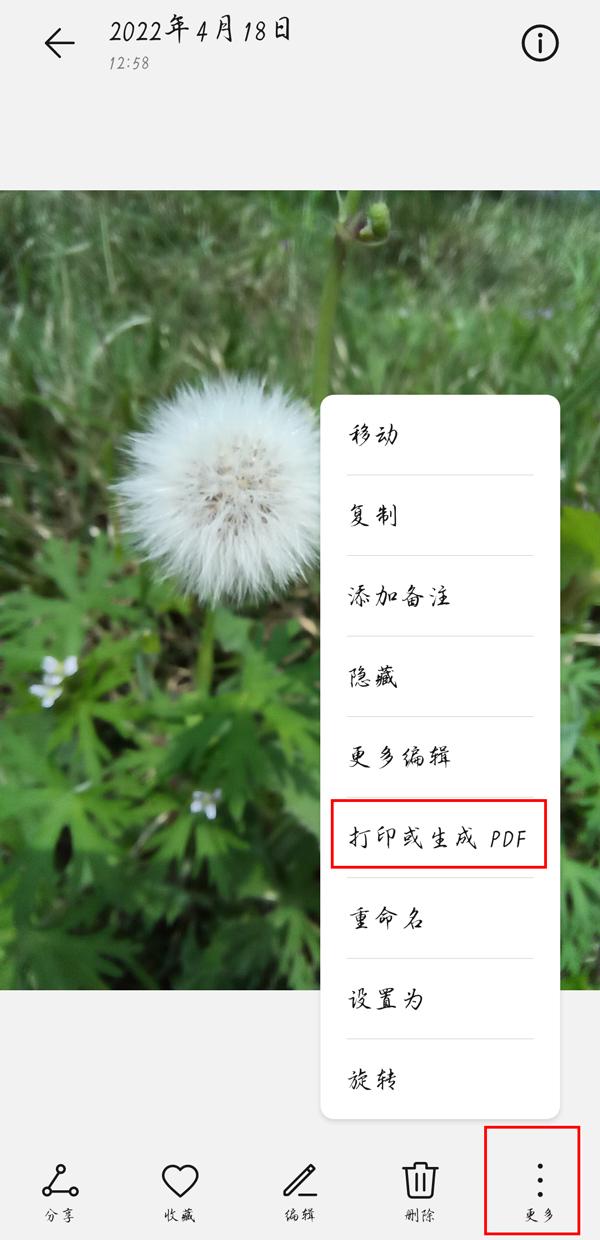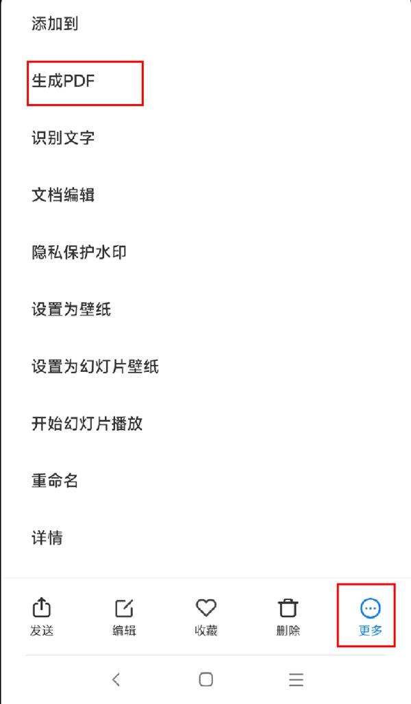 小米手机照片转换成pdf格式方法 在手机相册找到并点击进入需要转换成pdf格式的照片,点击【更多】,点击【生成pdf】即可。