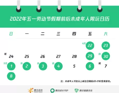 腾讯手游今日发布公告,2022年五一假期期间,未成熟的人可于4月30日-5月4日每天20点-21点登录手游。因调休而上班的4月24日(周日)和5月7日(周六)不能玩手游。