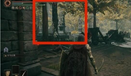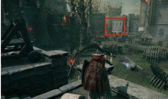 3、到达下图地点,并向红标处进发并走到尽头,此时会看到一个桥,桥上有三个巨人,可以无视他们。