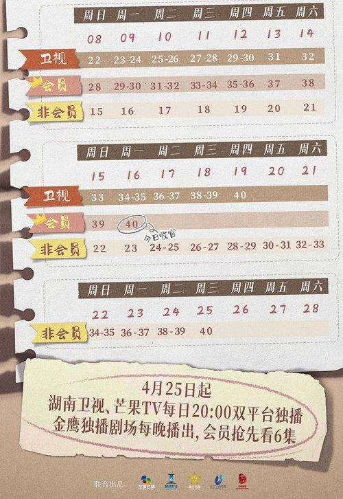 芒果TV会员:周一至周四每晚8:00点播出2集,周五至周一每晚播出1集,首日跟新8集,始终抢先卫视6集,5月16日大结局;