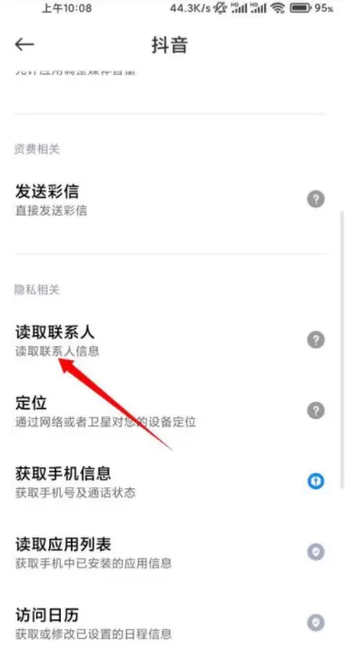 2,打开读取联系人,,将读取联系人权限后面的开关打开。