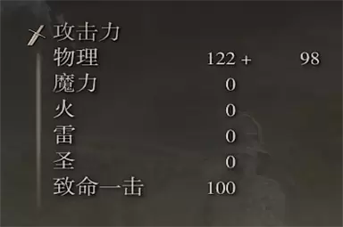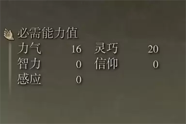 十字刀这个武器的需要16点力气和20点灵巧才能够使用,这个武器重量还好,但是对灵巧的需求较高,下面一起看看十字刀的属性面板吧!
