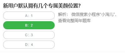 淘宝人生“桃仁300”的问答活动中每天都会有10道题目,只要答对一道题目就可以得到兑换券,“新用户默认拥有几个专属美颜位置?”,大家知