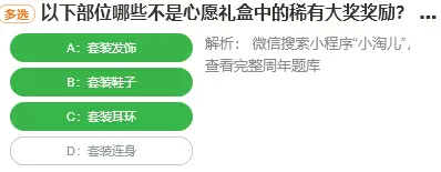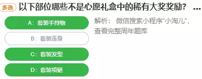 淘宝人生“桃仁300”的问答活动中每天都会有10道题目,只要答对一道题目就可以得到兑换券,“以下部位哪些不是心愿礼盒中的稀有大奖奖励?