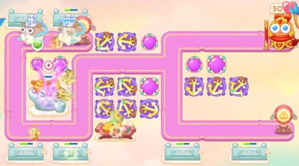 1.开局先在中间靠左边的位置放置一个船锚塔并升满,然后锁定其上方偏右的小障碍物。
