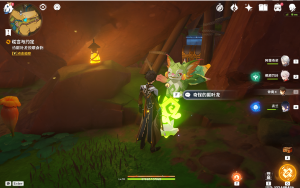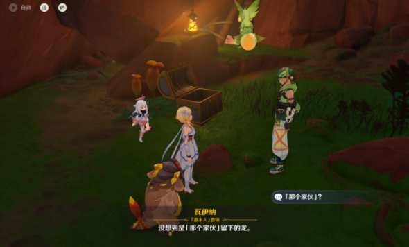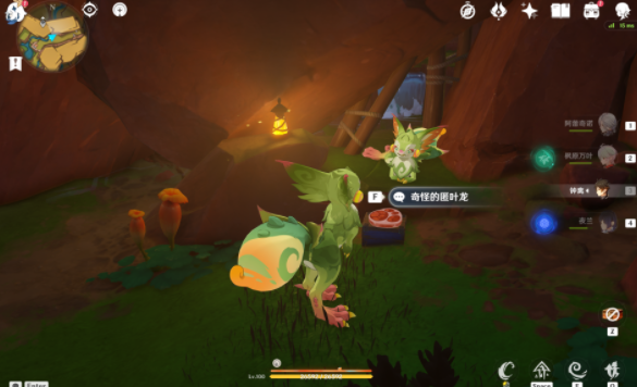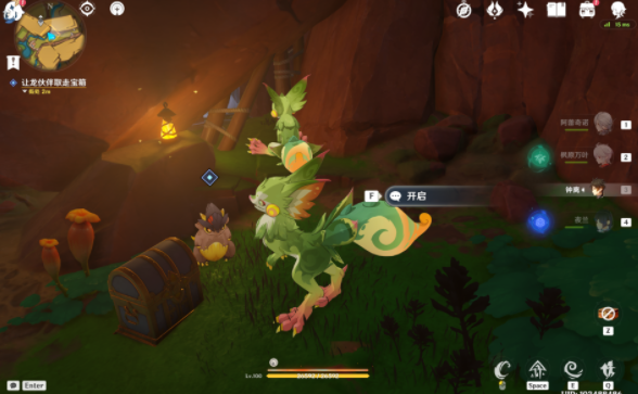 2、在右转后,你会目睹一只匿叶龙,它身后放置着一个璀璨的宝箱,但似乎它并不打算让开道路。