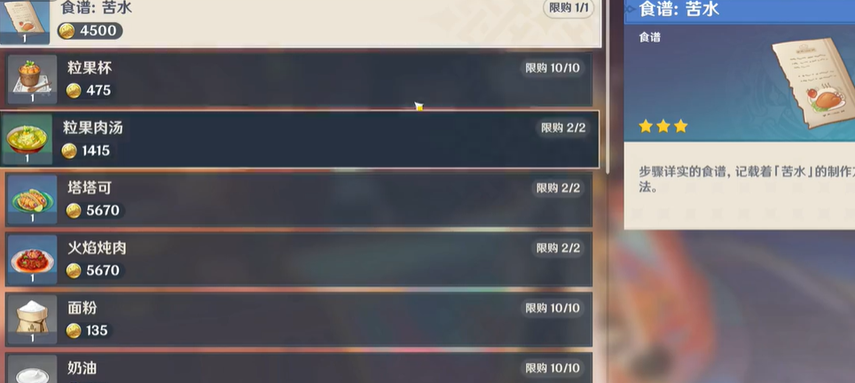 3、最后在食谱购买页面,消耗4500个摩拉币就可以获取苦水食谱