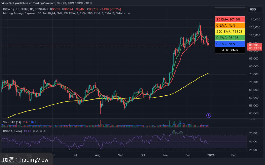 从12 月中冲上108,000 美元创新高以来,比特币近日持续回调盘整,截至今日(12/30)撰稿时已跌破94,000 美元。