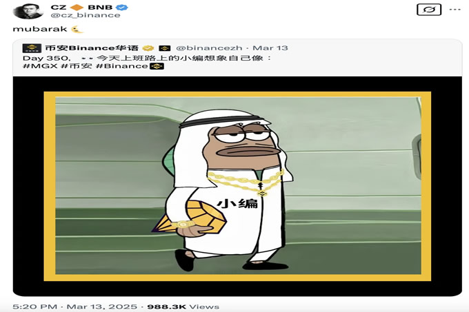 币安华语官方账号发文,并配图中东伊斯兰教信徒形象角色。随后该推文得到了 CZ 的转发支持,并配文:“mubarak????”(阿拉伯语,意为“祝福”)。