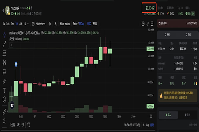 3 月 16 日晚,Mubarak 市值短时突破 9200 万美元,暂报 8400 万美元, 24 小时涨幅扩大至 85.8% ;3 月 17 日上午,Mubarak 市值突破 1 亿美元,现报 9800 万美元, 24 小时涨幅扩大至 158% ,并在随后一度上涨至接近 1.5 亿美元。截止撰稿前,根据 GMGN 数据,Mubarak 市值再度回升至 1.3 亿美元左右。