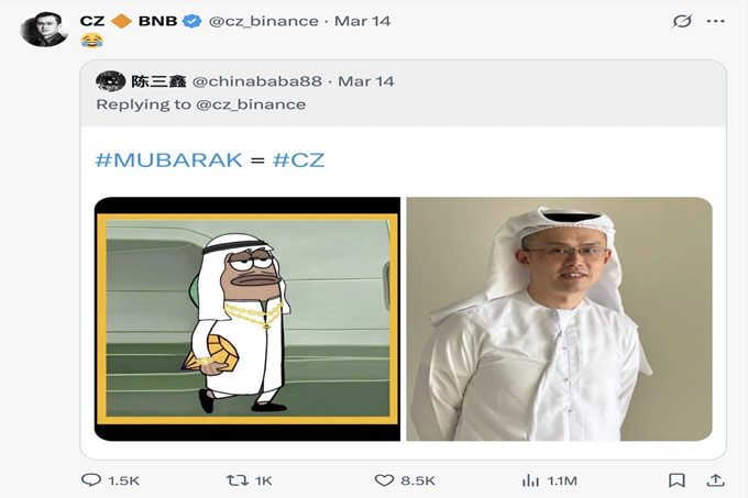 3 月 14 日,社区成员 @chinababa 88 于 X 平台评论区发表“ MUBARAK=CZ ” 梗图,得到了 CZ 本人的转发,并配有“ ???? ”表情,看得出来,他对这个梗也非常认可及关注。