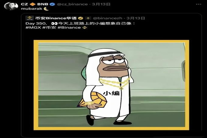 3月12日,阿联酋主 权基金MGX宣布投资币安的消息刚刷屏,第二天下午,币安华语推特账号就发了一张“小编”身穿阿拉伯长袍的恶搞图。