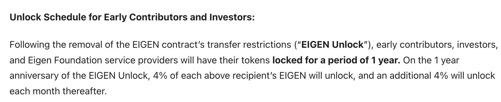 EigenLayer 此前披露的代币经济模型中,明确强调了早期贡献者及投资人的份额有“为期 1 年的锁仓限制”。EIGEN 合约的转账限制移除后,早期贡献者、投资者和 Eigen 基金会服务提供商的代币将被锁定一年。一年之后,上述每位接收者的 EIGEN 将解锁 4%,此后每个月将额外解锁 4%。