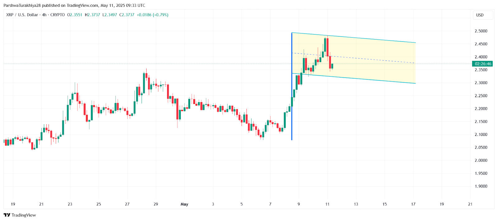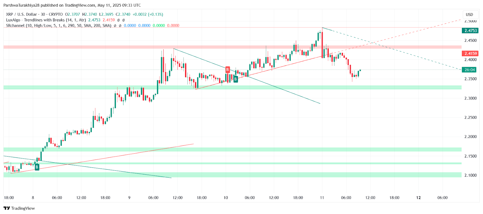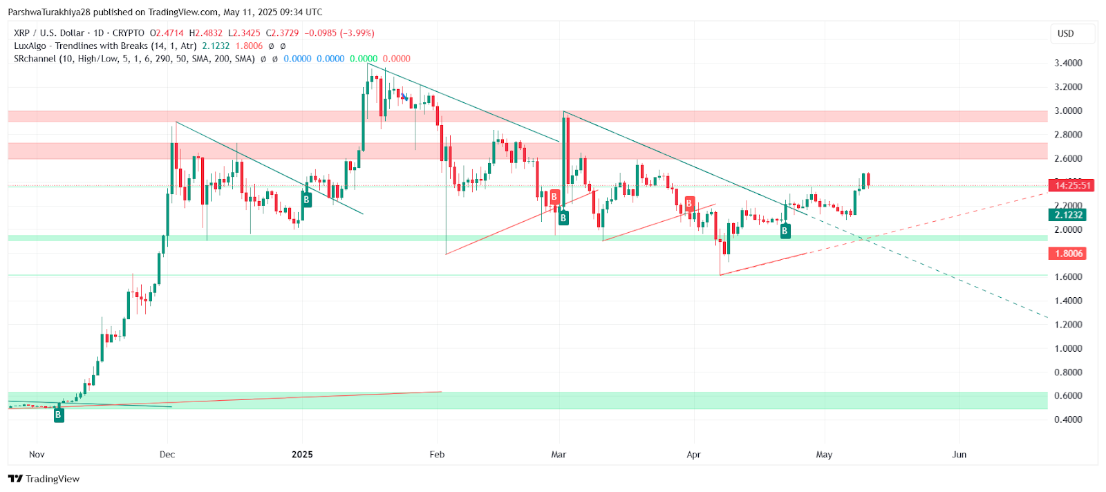 目前XRP的价格在2.37美元附近徘徊。此前,XRP曾突破了一条长期的下降趋势线,这是一个积极的信号。然而,在2.47美元附近,空头力量开始增强,价格走势变得谨慎起来。