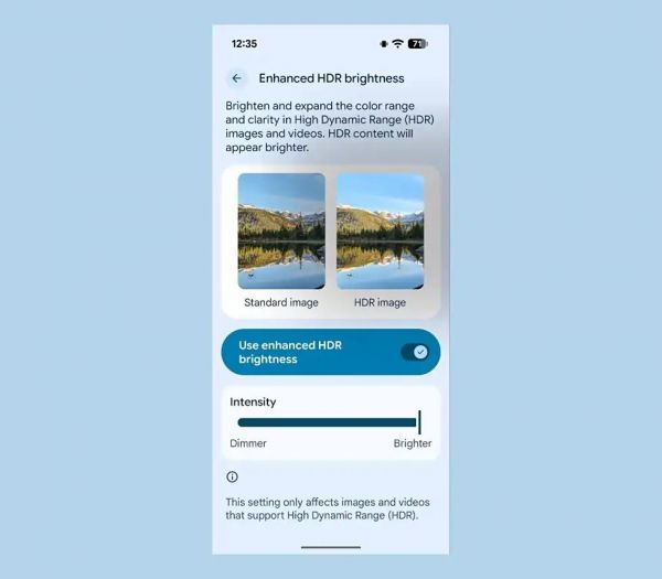 QPR2 在显示设置中新增了“HDR 亮度增强”选项,能够提升高动态范围(HDR)图像和视频的亮度、色彩范围和清晰度。在 Pixel 9 Pro 上,启用该功能后,HDR 内容会显得更亮,用户还可以通过滑块调整亮度增强的强度。