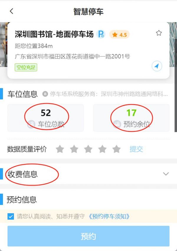 在“预约停车”页面选择需要预约的停车场、或者直接在搜索栏查询您想查找的目的地例如“深圳图书馆”,可以实时查看预约余位,输入预约入场时间(可提前1小时预约)、车牌号、联系方式提交即可。