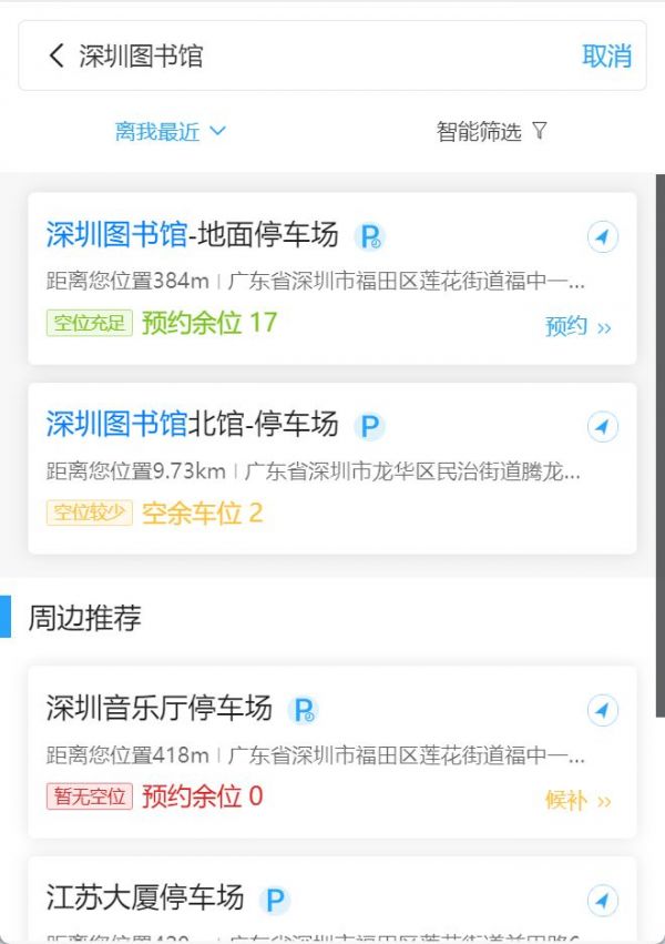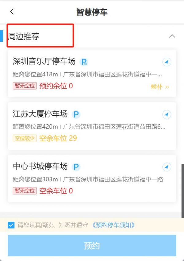 如果你想去的停车场暂时没有位置了,可以周边推荐停车场信息,多一个选择