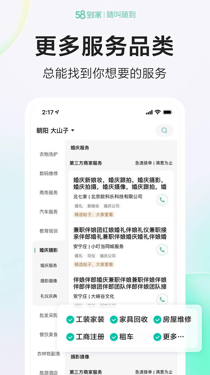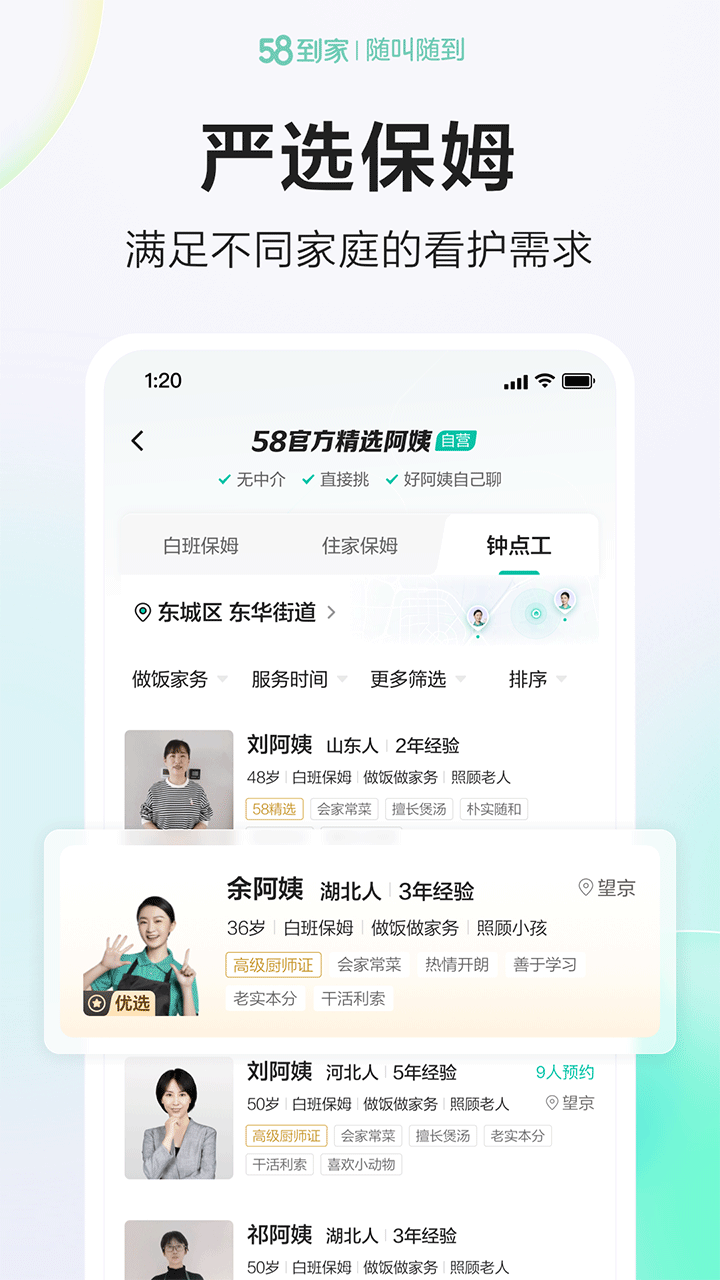 58到家app是由五八公司推出的生活服务平台,用户可以预约月嫂、保姆和上门维修师傅,每一位工作人员都是经过专业培训,每位工作人员的技能侧重都会不同,根据家庭需求精选不同技能的阿姨,让用户的家庭生活更安心,还有日常保洁和深度清洁等打扫方式,专业勤快的保洁会还您一个一尘不染的房子,还有预约搬家、电器维修、汽车服务、衣物清晰等囊括用户生活方方面面的服务,选用58到家用的更安心。