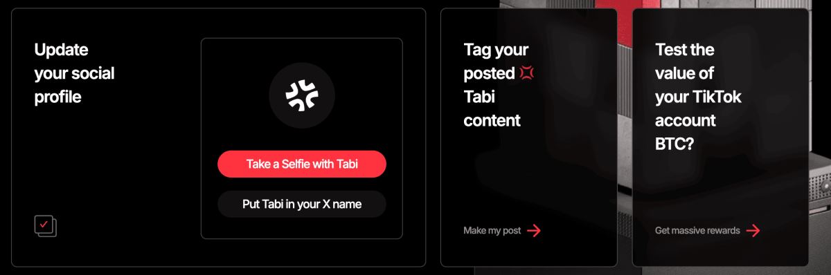 访问 Tabi 空投官方页面,完成所需的参与任务,并连接您的 Web3 数字地址即可获得 $TABI 奖励。
