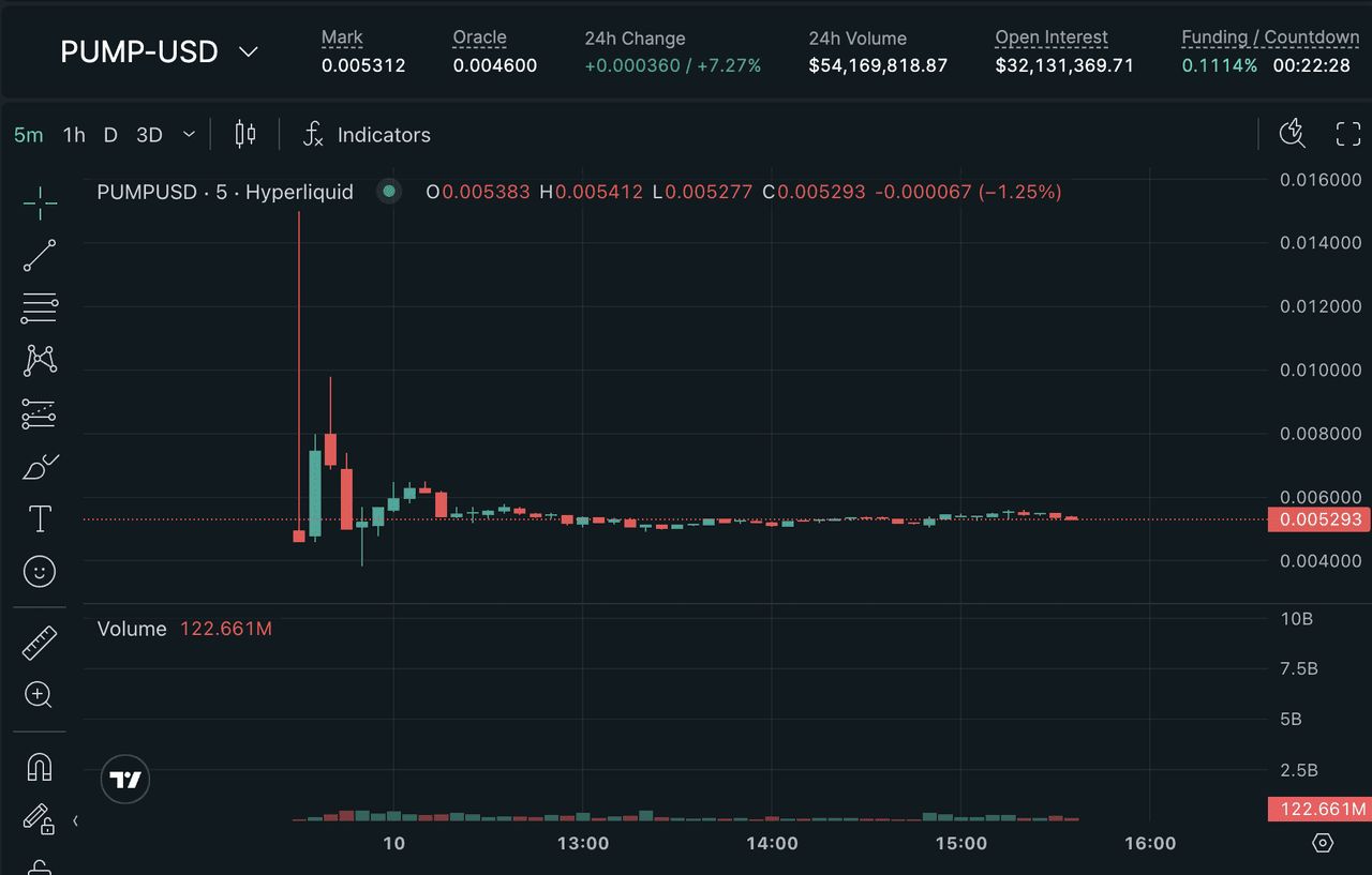 在正式启动之前,$PUMP 开始在 Hyperliquid 上以永久合约的形式交易,并迅速获得了吸引力。该代币的开盘价格为 $0.00529,比其公开发售价格 $0.004 高出近 40%。在前 24 小时内,$PUMP-USD 交易对创造了超过 3000 万美元的交易量,未平仓合约增长至超过 1700 万美元。这一早期需求表明,交易者预期该代币在可转移后会有强劲的上市表现。
