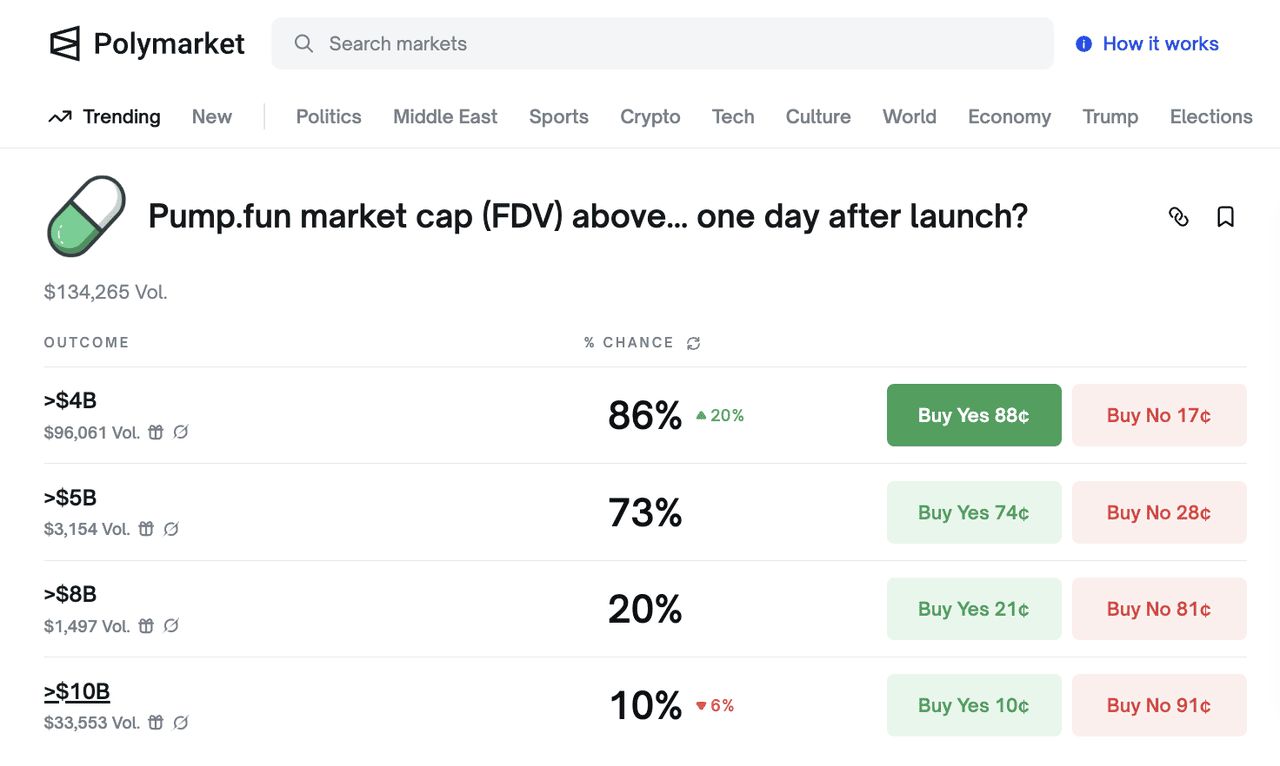超过 40 亿美元 FDV 的机率为 86%,表明大多数交易者认为 $PUMP 将迅速获得吸引力,并实现至少 10 倍于初始公开发行的估值。