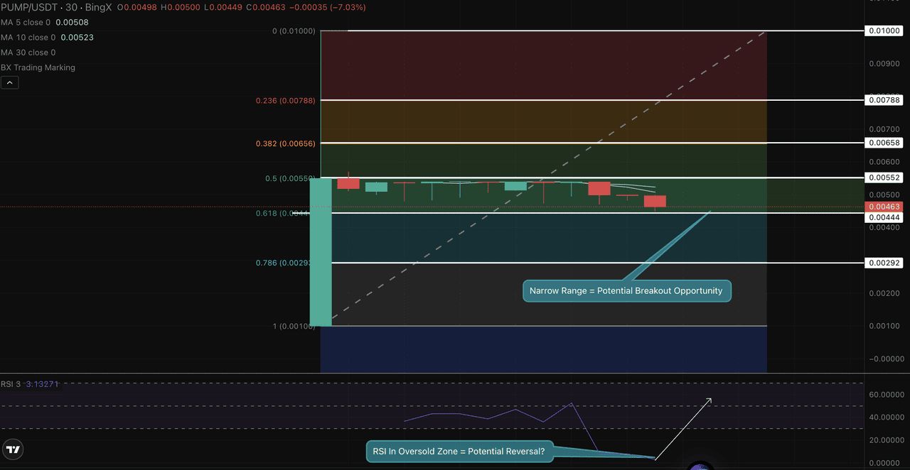 30 分钟图表显示出 PUMP/USDT 经典的拉升后回落,随后进入横盘整理阶段。在初始大幅上涨后,价格急剧回调,回落至 50% 和 61.8% 的斐波那契回撤位,这表明早期买家可能正在获利了结。