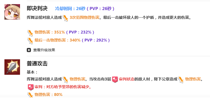即决判决这就是一个主要的输出技能,冷却的时间是26秒。挥舞法槌就可以直接造成范围性的物理伤害,最后一次攻击就更加的厉害,不仅伤害很高,也可以直接砍掉敌人的护盾,如果遇到一些带有护盾的敌人,那简直就是一个克星。普通攻击确实也会比较讲究,基础攻击是80%的物理性伤害,如果是打在有三层审判的敌人身上,那就可以直接追加160%的物理性伤害。在经过强化之后会更加的离谱,会造成110%的范围性伤害,并且还会有一个审判的优势。