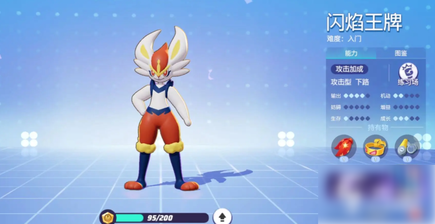 闪焰王牌属于攻击型拥有很高的体能,在爆发力方面更是能在所有宝可梦中处于顶级水平,他的特性能在体力一半以下时,提高自身20%暴击率,且提高10%攻速,每一次使用的时候下一次普攻会变化,强化普攻,普攻和招式击中敌人都能在其身上留下火种,火种叠加到一定层数会引爆造成额外伤害;