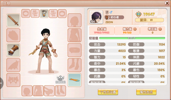 角色系统点击主界面角色信息栏处唤起属性界面,界面左侧为玩家装备栏;右侧为玩家属性栏、属性加点模块。