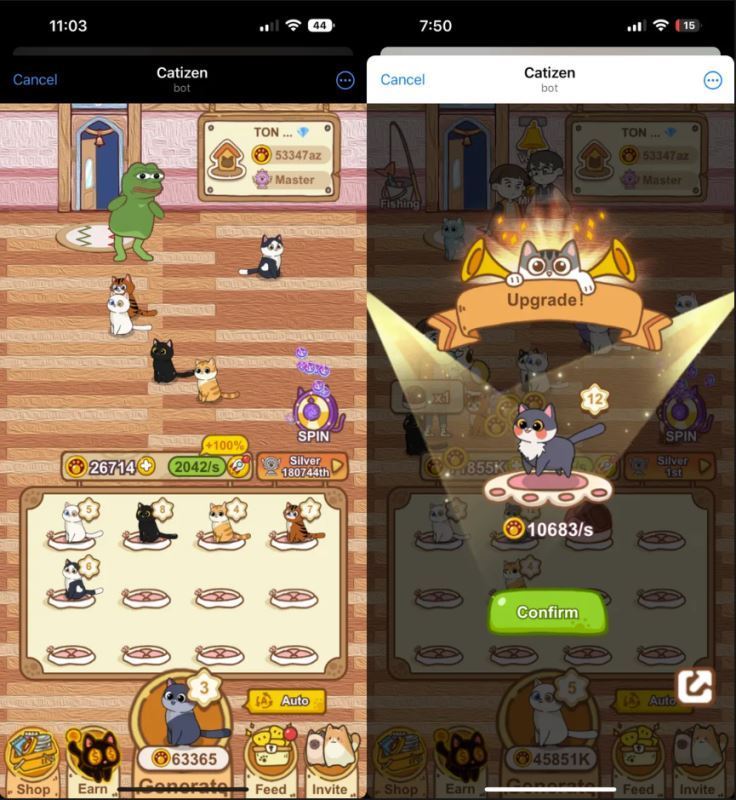 Catizen 采用了完全不同的玩法,放弃了点击,转而采用类似 Threes 和 2049 的益智游戏模式。你需要将相似的猫咪配对并合并,赚取更多金币,同时吸引人们来收容所领养猫咪。