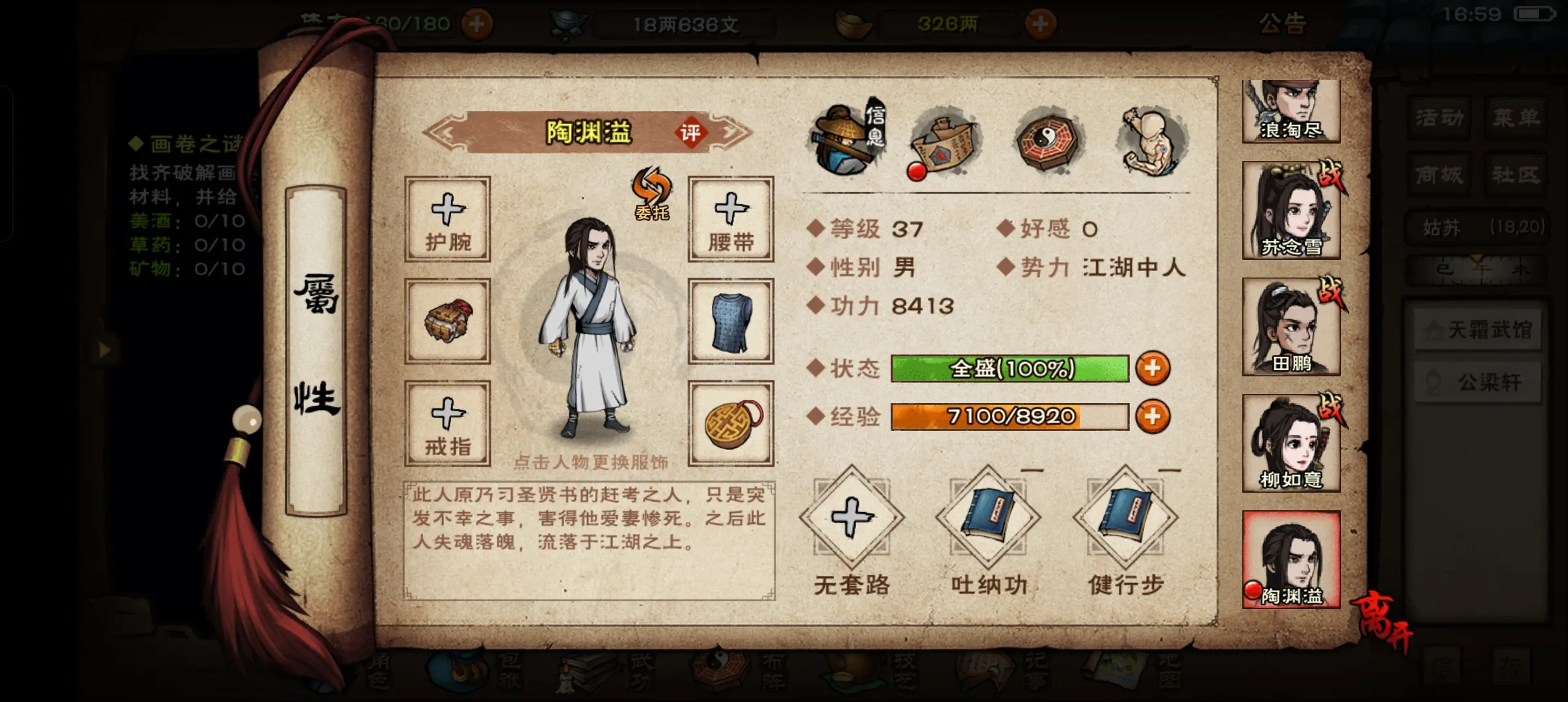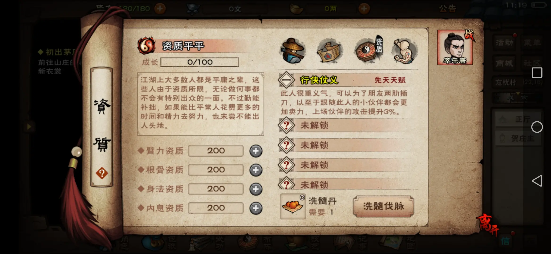 【闻鸡起舞】每场战斗增加10%的阅历,丹田容量提升100点。
