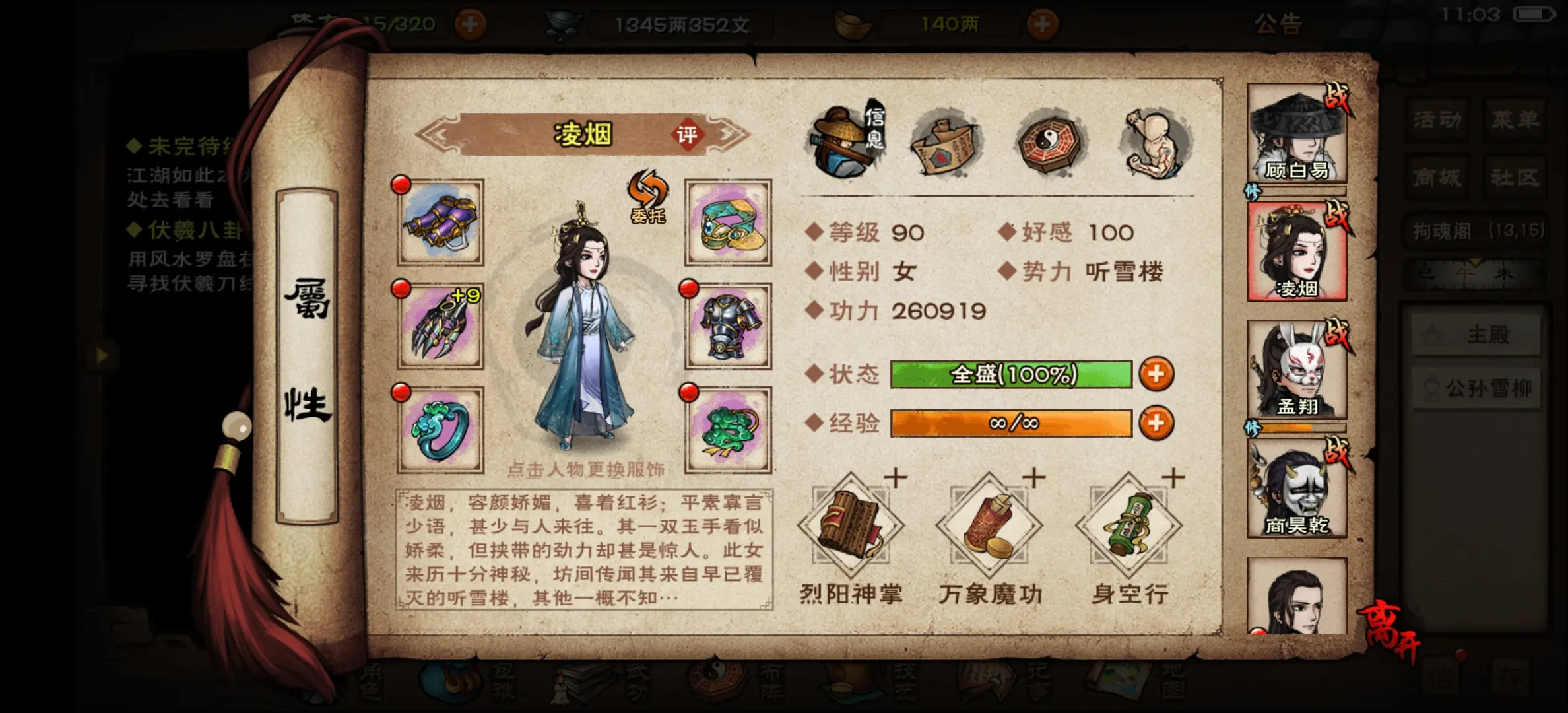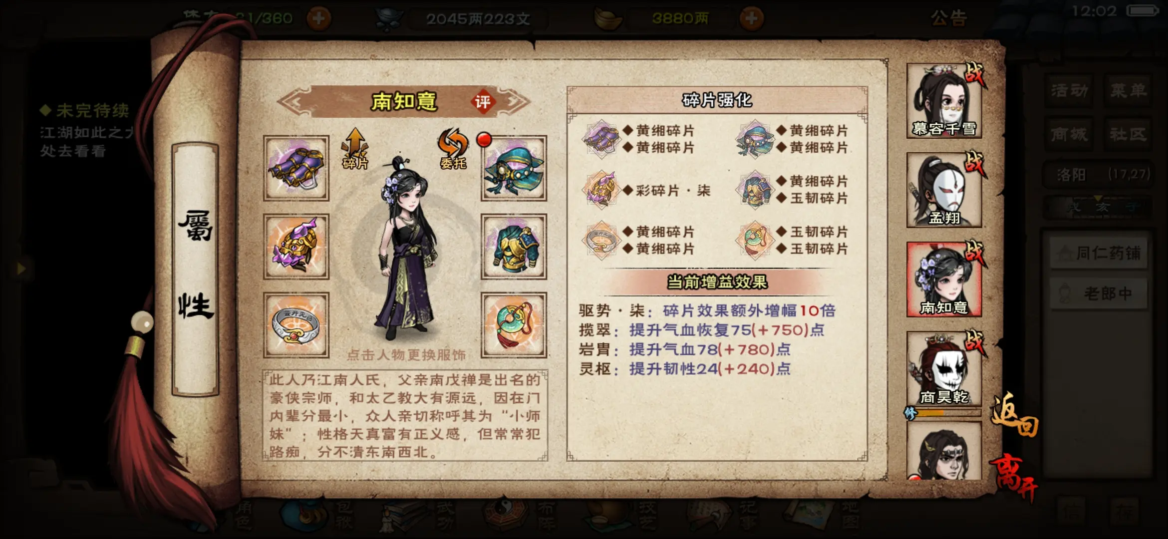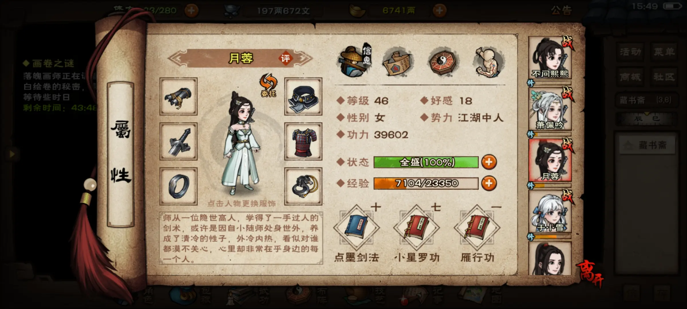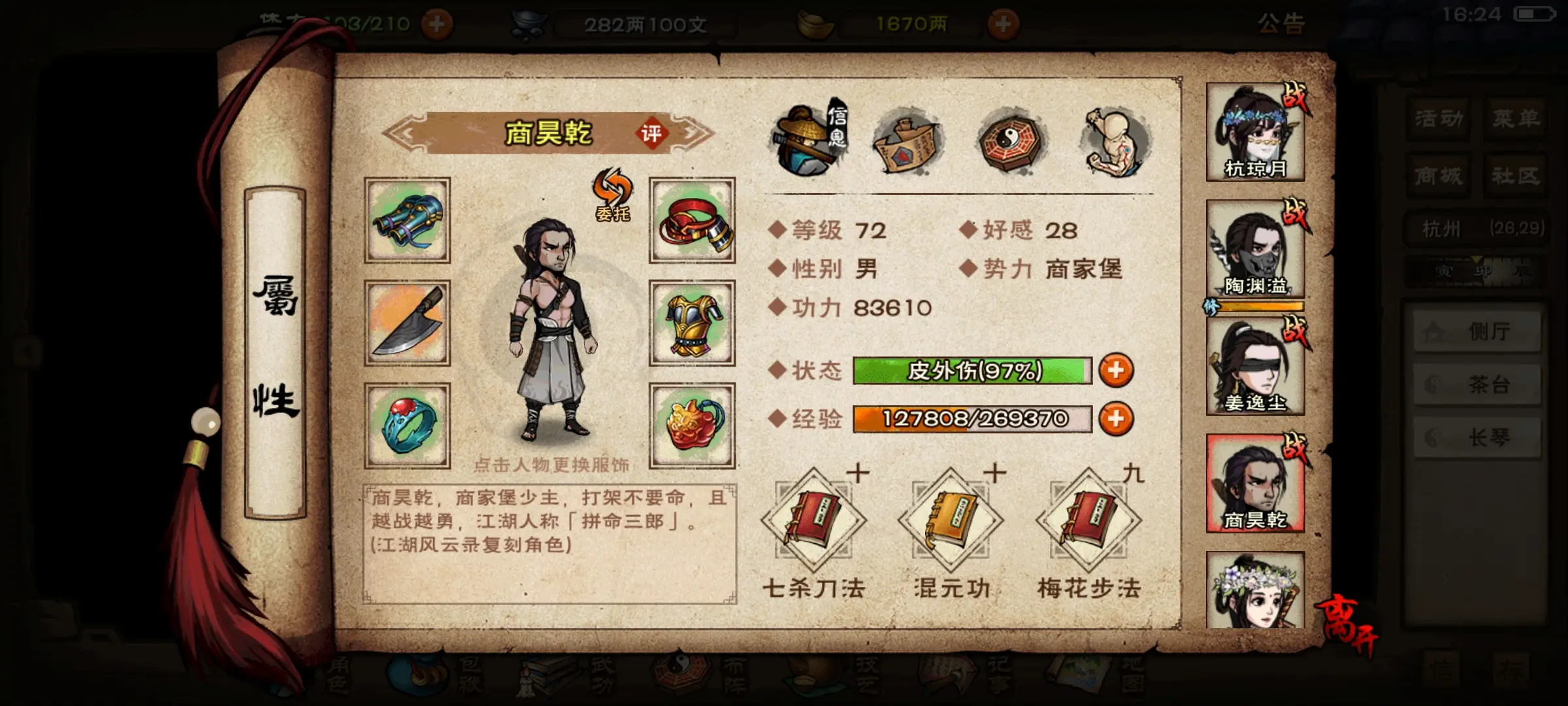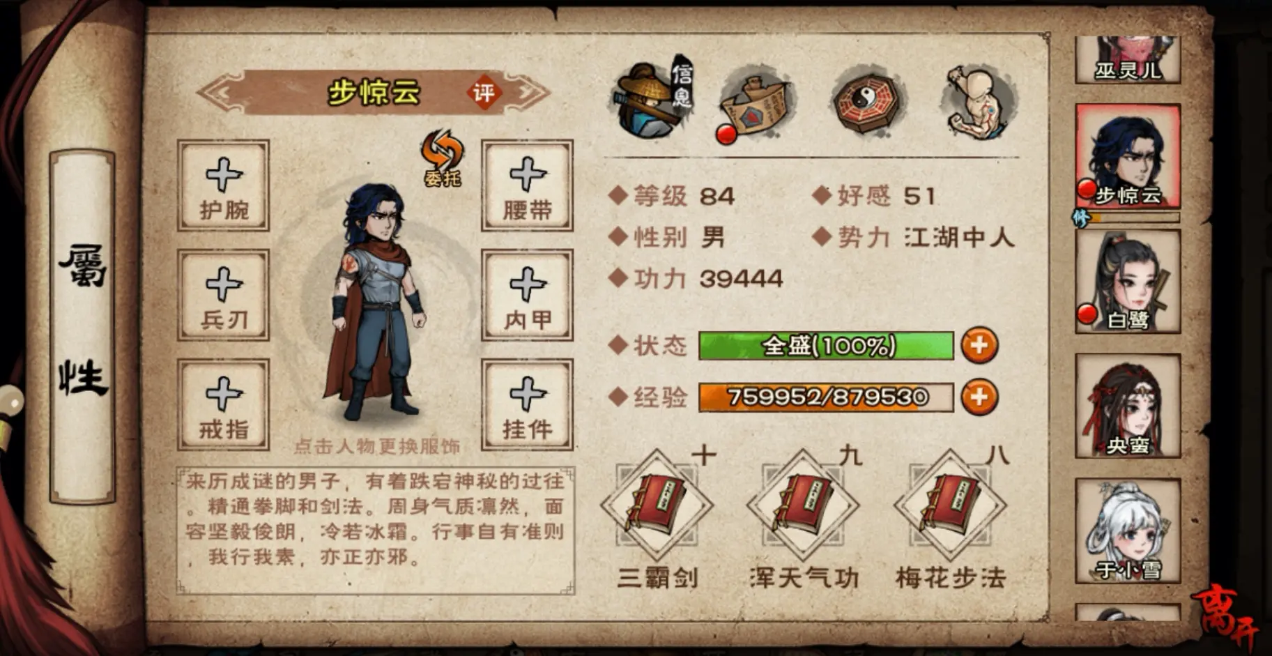 商城角色,3000元宝可随时购买,全能的五年真主角,能打能扛,数值与机制都比较优秀,机制(拼命三郎,每掉1%血量 + 0.5%攻击),培养较为简单,前身为烟雨江湖前作“江湖风云录”的随从,一直是随从中的不二之选,目前因步惊云的登场有所影响,但考虑到随时可以买以及全能而排第一